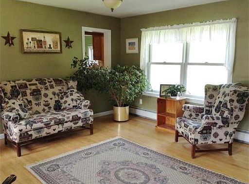 Elegant in-town 1850s colonial, spacious rooms, modern amenities, space for entertaining. The special feel and flow of this house is immediately recognizable. Wrap around porch, classic colonial front hall w open stair to the 2nd floor. Family rm, study, living/dining areas w built in shelving, bay window with floor-ceiling windows, maple floors, modified Rumford fireplace. Farmhouse kitchen with picture window to lilacs outside, stainless counter/appliances. Off kitchen is garage that was once the barn. 1st floor laundry with original cast iron sink. 2nd flr master suite of 2 rooms and 4 other bedrooms. Pine or maple floors. Full bath w oval soaking tub, shower, granite counters. 1st floor bonus rm ready to finish, incl original brick fireplace-lore says room was tavern stop in its day. Could be 1st floor master suite, great room, home office/separate entrance. South facing, ready for solar. Mature gardens apple trees. Air-sealed, Buderus installed 2011. Amherst UMass minutes away.