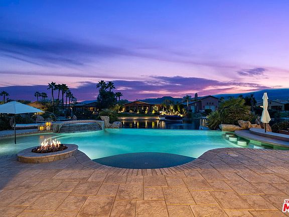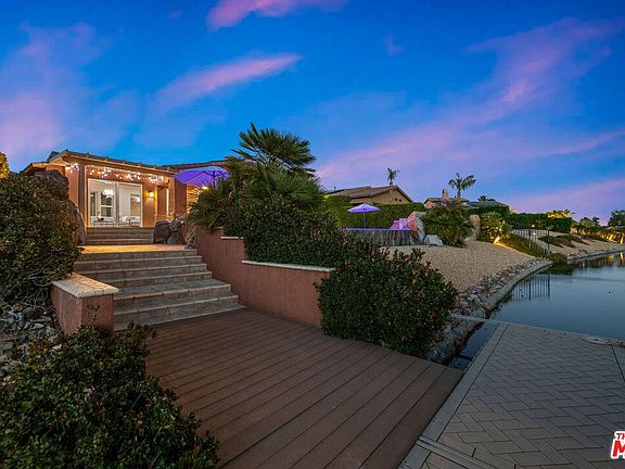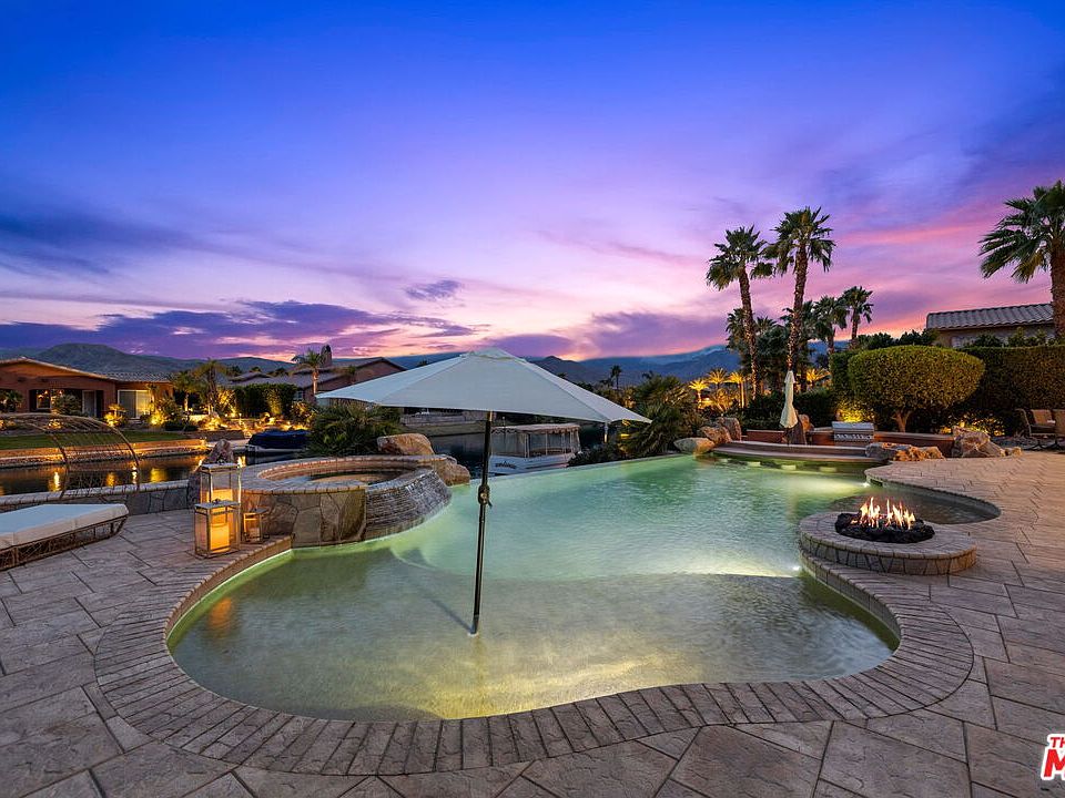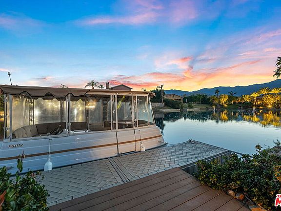 LUXURY LAKE FRONT DESERT LIVING AT ITS FINEST! Perfectly situated on a SOUTH-FACING lot in the highly desirable gated lake community of Santo Tomas, 7 Via Santa Elena offers a unique south-facing backyard with all the bells and whistles - infinity pool with two tanning ledges and bar seating by the built-in BBQ station, hot tub, fire pit, and steps leading to the private dock for your 16' Duffy electric boat. Spacious 3 bedroom, 3 bathroom home with upgraded high-end kitchen appliances including a built-in refrigerator and granite countertops. Enjoy serene views of the lake and mountains from nearly every room of the house! The primary bedroom has a large walk-in closet, dual sink vanities, walk-in shower, tub, and direct access to the backyard. The guest bedroom with en suite bathroom and walk-in closet has direct access to the side yard and pool. Currently used as a home office, the third bedroom has a custom Murphy bed. Low HOA dues includes a social and sports membership to the Mission Hills Country Club (pool, tennis, fitness, croquet, pickleball, restaurant). Enjoy desert living at its finest! Duffy electric boat included with the home.