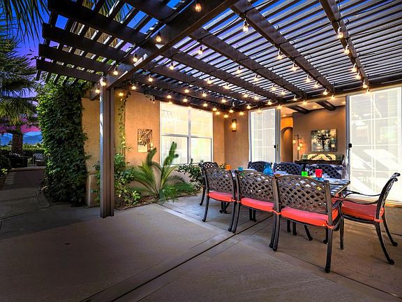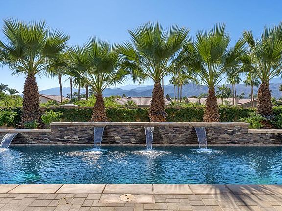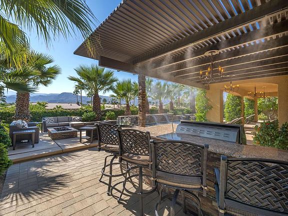 SOUTH Facing with sweeping spectacular South and West MOUNTAIN VIEWS! BEST Kept secret in the entire valley! Scenic 9-acre Recreational Lake surrounded by 5 parks w/waterfall & a boat launch. The low HOA fee of $340 per month includes a sports, gym, and social membership to the adjacent Mission Hills Country Club. Enjoy amenities such as tennis, pickleball, bocce ball, croquet, pools, spas, restaurants, and a gym. Experience the elegant Santo Tomas lifestyle, the privacy of a beautiful, gated community & the flair of Desert architecture in this entertainer's dream! Enjoy privacy from one of the many destination patio areas or meander down to the community dock for a sunset cruise on a kayak or boat! The outdoor living space is truly extraordinary, designed for entertaining and relaxation. Large outdoor Kitchen with built-in bar, Jade BBQ, side burner & refrigerator. Huge 54 x 15.5 ft private pebble-tec Pool & Spa with sheer decent water features & swim deck, built-in gas firepit cocktail table. Commercial Misting system cools the huge, covered patio and the separate dining pergola all with dimmable lighting. This home offers three bedrooms & three bathrooms, providing ample space for family and guests. The master suite is a tranquil retreat, offering a private oasis with stunning mountain views. Walls were removed to create a wide-open floorplan from the kitchen to the expansive great room w/ cozy fireplace. Furnishings are negotiable. Don't miss this incredible opportunity!