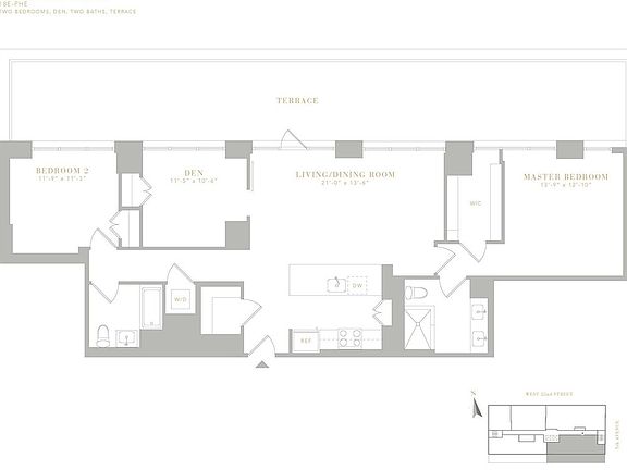 Breathtaking 2 bedroom plus den with large private terrace. This great apartment features walls of dramatic floor to ceiling windows including in the light filled den space, a gourmet kitchen with stainless steel appliances, stone countertops, an eating bar and pantry. Apartment also contains an in-unit washer/dyer, and a primary bedroom suite with large walk-in closet and bathroom with double vanities and oversized glass enclosed shower. In the center of NYC's landmark district and bustling Flatiron neighborhood, 7 West 21st offers a tranquil sanctuary complete with a sunken garden, landscaped courtyard and 2 roof-top terraces equipped with TVs, grills and additional entertaining spaces. Residents also enjoy a state-of-the-art fitness center and yoga studio, multiple lounges, a game room with a golf simulator and a children's playroom room. The building includes a 24-hour concierge and is pet friendly. Pricing and concessions subject to change. Floor plans and photos may be of a representative unit.