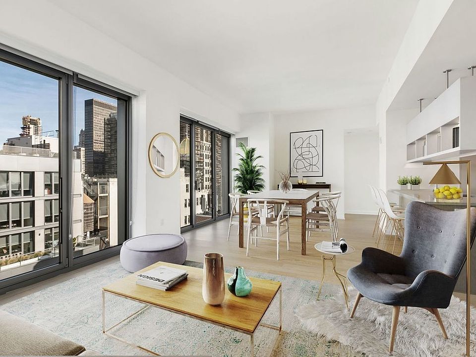Sprawling and light filled 2 bedroom with walls of dramatic floor to ceiling windows and an open flowing layout. Apartment also features a gourmet kitchen with stainless steel appliances, stone countertops an eating bar and pantry, an in-unit washer/dyer, split bedrooms, and a primary bedroom with an en-suite bath with double vanities and a glass enclosed shower. In the center of NYC's landmark district and bustling Flatiron neighborhood, 7 West 21st offers a tranquil sanctuary complete with a sunken garden, landscaped courtyard and 2 roof-top terraces equipped with TVs, grills and additional entertaining spaces. Residents also enjoy a state-of-the-art fitness center and yoga studio, multiple lounges, a game room with a golf simulator and a children's playroom room. The building includes a 24-hour concierge and is pet friendly. Pricing and concessions subject to change. Floor plans and photos may be of a representative unit