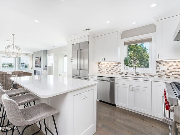 Presented for sale is a rarely available waterfront home on Banks Channel. Stunning unobstructed water views, this home has sweeping views of Banks Channel where you can capture some of the most spectacular sunsets on the NC coast. Imagine stepping out your back door, walking down the pier to your 25' slip, & hopping on your boat for a fun day on the water. Improved with bulkheading, pier, gazebo, a boat lift and a floating dock - enjoy this setting and great spaces inside and out! Renovated with only the finest materials, this home combines sleek clean lines of modern design with highlights of coastal tradition. This amazing Wrightsville Beach 3 bedrooms plus a bonus room, 4-bathroom home has plenty of space for your family & friends, and offers everything waterfront property should. The main floor features: a spacious, open concept kitchen, dining, and living room with a modern fireplace; opening onto a large balcony for soaking up the sun and sound side breezes. Entertaining will be effortless. The highly functional gourmet kitchen offers Quartz countertops, large center island, custom cabinets, Wolf range, EdgeStar wine cooler. Professionally decorated, the finishes are spectacular. Custom tile, wallpaper, and lots of extras. The main level also has the 1st bedroom with a full bathroom. The second floor includes the 2nd bedroom with a private bathroom, laundry closet, and primary suite. A huge shower with frameless glass enclosure, large walk-in closet & second bonus closet, large primary bedroom, and tremendous balcony with views you must see! The ground floor features a bonus room that can be used in a variety of ways and the 4th full bathroom. Off the back patio, there's an outdoor shower and two storage rooms for your water toys. New Trane HVAC Spring 2022. Steps from the ocean, restaurants, and grocery, this home is in the heart of Wrightsville Beach. This is coastal living at its finest, ready for you to create a lifetime of memories - your coastal