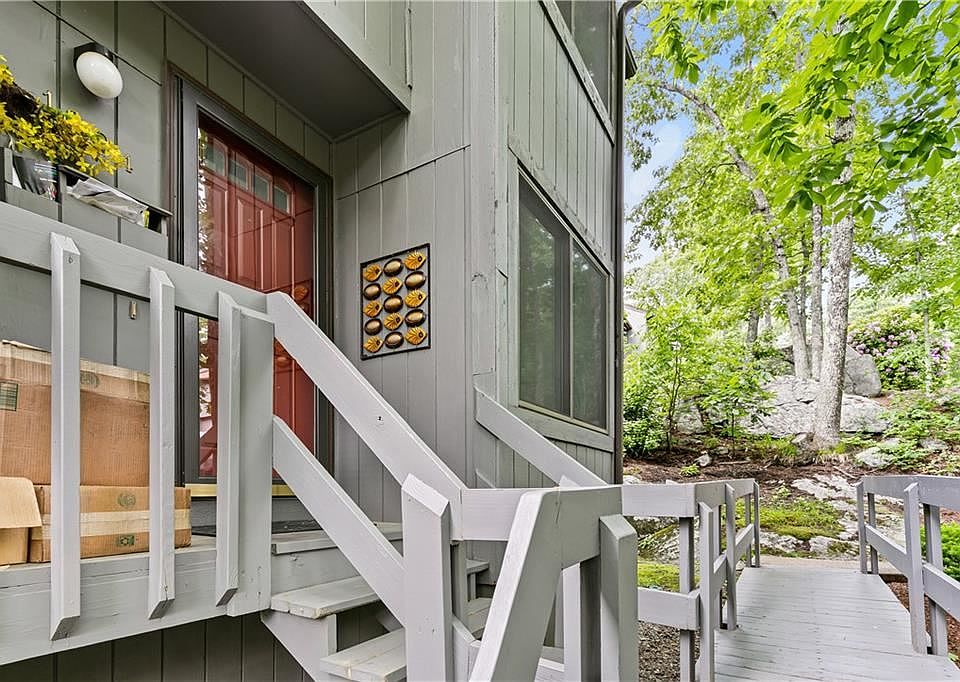Searching for a beautiful townhouse in a serene setting? Well look no further! This end unit has a large wrap around porch, one car garage and plenty of storage. Once you enter, you will start picturing yourself here! The open floor plan main floor level with an updated kitchen showcasing granite countertops, white cabinets and plenty of space! The gleaming hardwood floors brings you to the sunsplashed dining room with a slide to enjoy your porch this Summer and a wood burning fireplace for those cold days of winter. Upstairs are two spacious bedrooms both with walk in closets and an oversized bathroom completes this level. The basement is finished and allows for even more storage and an office, home gym, play room, you name it! Location is ideal for commuters and minutes from great restaurants and to Massachusetts. Enjoy the homestead reduction in taxes if owner occupied! Taxes ONLY $2700.67 with the homestead!! Showings begin immediately.