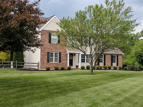 Gorgeous two story colonial on a sprawling corner lot in the quiet Grist Mill Farms neighborhood! This property is a true prize as the owners kept it in great shape and have made continuous upgrades. When you approach the house take notice to the beautiful brick and vinyl siding along with marvelous landscaping which makes the exterior picturesque. Through the front door it won't take long at all to see the constant maintenance that gives this home added value with glimmering hardwood throughout the entire main level, along with flawless neutral paint, with crown moulding and chair rail. To the left you have the formal living room which is drenched in sunlight and overlooks the front yard. Over to the right of the front door is the dining room which also connects the kitchen off the back of the main level. It is an unbelievably gorgeous kitchen with granite countertops, modern backsplash, stainless steel appliances, dimming recessed lighting, built in wine cooler, flat top range with exhaust hood, and a deep pantry. The kitchen extends a laundry hallway off the back which leads to the 2 car garage indoor access, and opens up to the family room to complete the main floor. The family room comes equipped with built-in bookshelves, a gas fireplace, and french doors leading out to the sun room. The sun room is fully enclosed with a ceiling fan and composite decking and gives the owner and guests views across the entire back yard and farmland across the street. Up the steps are 4 bedrooms including a hallway bath and enormous master bedroom consisting of hardwood flooring, a sitting area, walk in closet, and attached bathroom with tub and stand up shower. The basement has been fully framed and could be easily finished off or used a workshop with plenty of room for storage. This is a full acre lot with a completely fenced in yard, shed in the back, and even apple trees on the property! The property itself provides easy access to all major highways, the local YMCA, and shopping close by. Ready to show!