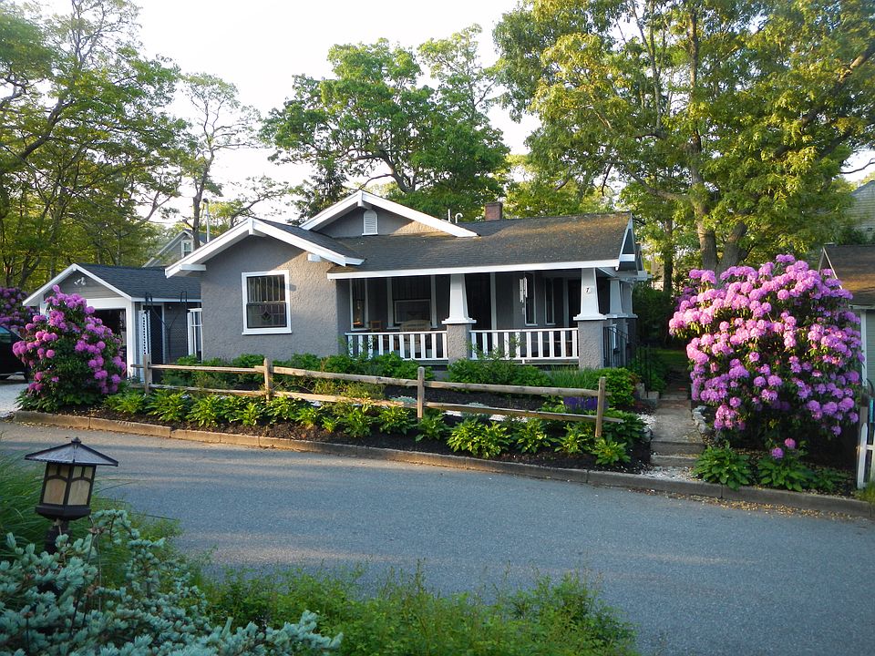 Completely remodeled Arts & Crafts Bungalow. Gorgeous hard wood floors, stone fireplace, stained glass windows, wrap around porch with water views and exposed wood beams in open floor plan. Kitchen features custom built cabinets, generous sized soap stone sink, and stainless refrigerator. 1200 sq ft, 2 bedrooms & 2 bathrooms, Central A/C, Garage, double lot landscaped yard, full basement, Water views and not in a flood zone. Master bathroom with large glass shower with custom tiles and brand new stackable washer & dryer. Walk to town center, Synagogue and beaches.