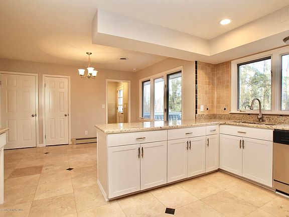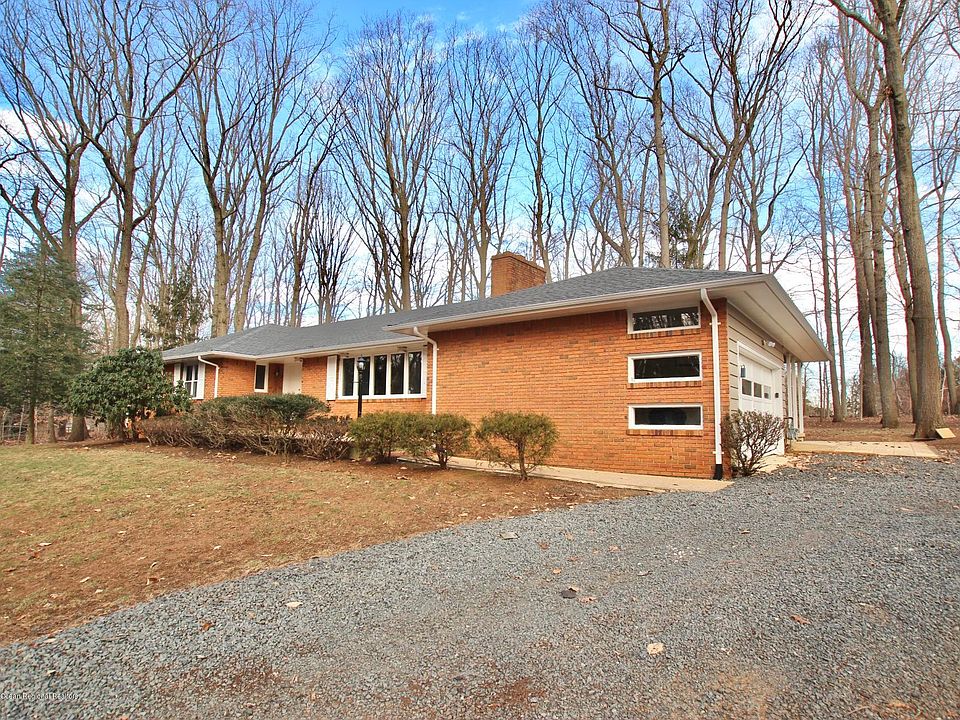 Beautifully renovated brick ranch on a 1.8 acre wooded lot. Newly refinished wood flooring. Eat-in-kitchen features granite countertops, white wooden cabinetry, stainless steel appliances and breakfast bar. So much storage! Open living room with grand white-brick fireplaceLarge bedrooms, new bathrooms with attractive tiling work, twin granite counter sinks. Enormous full-finished basement with 2nd fireplace and antique refrigerator. Relax on your wood deck overlooking the expansive property.
