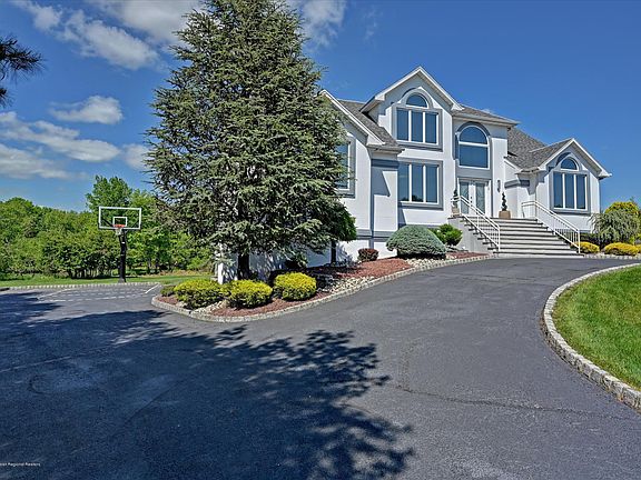 Beautiful custom contemporary located in desirable Marlboro. Home sits majestically on a cul-de-sac w/circular driveway on 1.5 acres. Interior features 2-story entryway, open floor plan, decorative moldings, square recessed lights and hardwood floors throughout. European kitchen w/quartz counter tops, SS appliances, center island, wine cooler, sliders to deck. Living room, dining room, great room, bonus room, bedroom on 1st floor. 2nd floor features 4 bedrooms, master bath w/rain shower and free-standing jetted tub. Finished walk-out basement w/day lite windows, bar area, bedroom, bathroom and sliders to pool. Private country club backyard w/lagoon style Gunite pool, spa, waterfall and tons of room to play. Half basketball court in driveway. Brand new roof. Over $100,000 in upgrades.