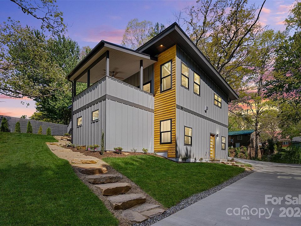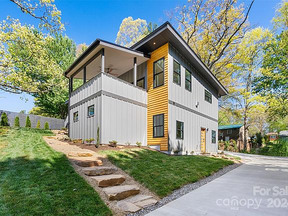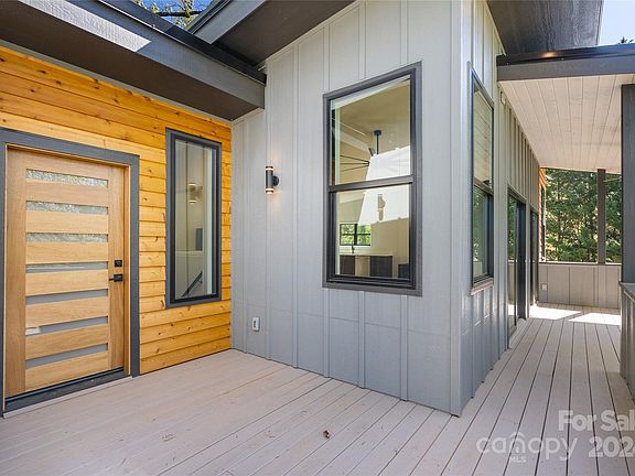 Custom modern new construction in walkable area of Weaverville on a quiet dead end street. Upper level features open floor plan with 9 to 12 foot ceilings, 6' windows for ample natural light. 28' x28' great room with modern kitchen, dining and living area with Vermont Castings propane stove. Primary suite with three closets and spacious bath. Large second bedroom and large tiled hall bath. Downstairs features interior and exterior entrances, large bedroom, full bath and family room. Two utility rooms for storage and projects. Covered deck allows shaded enjoyment of large lot with massive mature oak tree. Exterior has lockable outdoor storage are under deck for bikes, boats and lawn/gardening equipment.