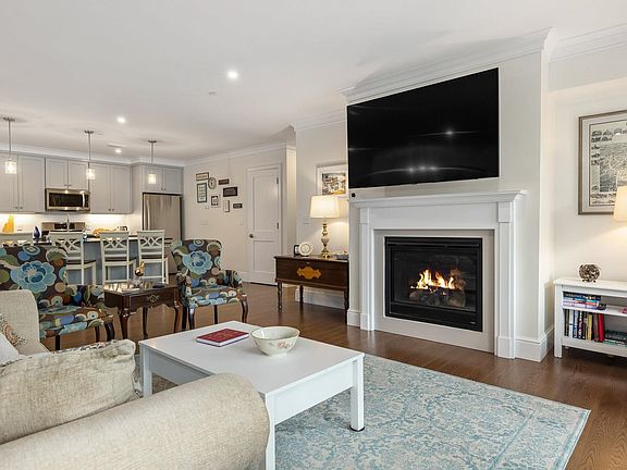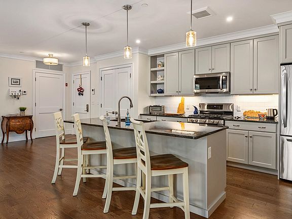 As close to new construction at Ray Farm you can get. This 3rd floor unit with a balanced floor plan is not to miss. The large open floor plan boasts a dining nook, an nearly 9' kitchen island, gas fireplace and a slider out to an oversized deck. The main living space has a coat closet, pantry closet and a laundry room. The windows are large to let in plenty of light. The primary bedroom is tucked into one side of the home with hardwood floors, a large walk in closet and beautiful bathroom with tiled shower. The second bedroom feels like another suite with its own bathroom, hardwood floors, and large closet. The beautiful custom blinds are just the right touch. Ray Farm has a beautiful clubhouse with large gathering space, outdoor grilling area and exercise room. A deeded parking space in the heated underground parking rounds out this extraordinary home. Ray Farm is a 55+ community. Open House Saturday June 24th 11am-1pm