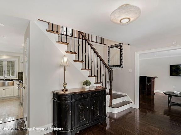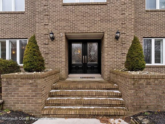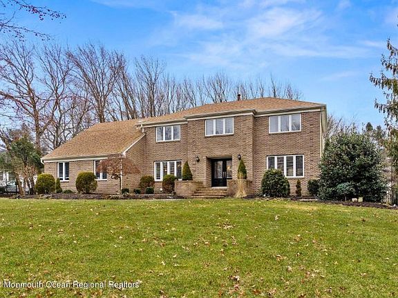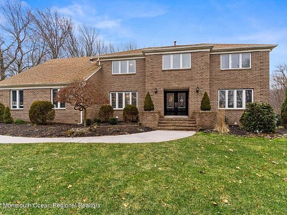Welcome to serenity and tranquility in prestigious Holmdel. Stunning, luxury home in highly sought after Windswept Woods. Stately colonial on cul de sac with numerous artisan details and custom finishes. Grand foyer leading to formal dining room with butler pantry leading to chef's kitchen with open plan leading to family room with fireplace and vaulted ceiling. Living room provides unique entertaining space with custom bar. Well appointed primary bedroom with en suite spa bathroom and separate dressing room. Finished basement boasts additional bedroom and media room.Natural light abounds with skylights and sliders leading to oversized deck for indoor outdoor living. Resort backyard with enchanting landscape details, gunite pool, and basketball court round out this magnificent home.
