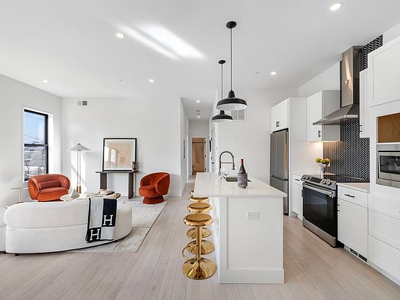 New to market! Spacious 3 Bed/2 Bath Penthouse built in 2023! 7 Wordsworth PH5 has an open floor plan with soaring ceilings, TWO PRIVATE outdoor spaces including 400 square foot roof deck with views and DEEDED GARAGE parking included! Large kitchen with Quartz island, shaker cabinets and stainless appliances. Plenty of space for 6+ person dining table. Private balcony off living area. Oversized Primary Bedroom with walk in closet, en suite bath, double vanity + large tiled shower. Two large guest bedrooms with plenty of additional closet space, either of which could also serve as a large home office. Hardwood floors throughout. Recessed lighting, Central AC, in-unit washer/dryer. Ideal location within walking distance of Wood Island T, multiple bus stops, direct highway access + minutes from Logan Airport.