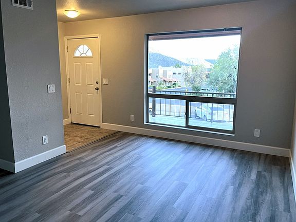 Great location just minutes from Sedona. Close to shopping, dining, and trails. This fully remodeled, second floor unit features new, wood inspired luxury vinyl plank flooring throughout. 2 bedroom 1 bathroom unit with some red rock views especially in fall/winter. Private patio off the second bedroom and a large, shared back yard/common area. Master bedroom has 2 big closets and a large window. Bathroom has full size tub, ample lighting, a large vanity plus a linen closet. The kitchen includes a complete appliance package with a washer and dryer in the unit. Water and trash included in the rent, tenant pays electric. 2 car maximum per unit. Pet negotiable. No corporate leases permitted.