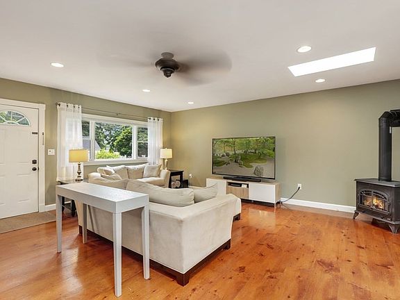 Situated just 1 mi. from the “Best Main St. in America”, this lovely Ranch offers an open-concept, sun-filled rooms, & numerous updates throughout! The spacious great room boasts wide plank floors, skylights, & a gas stove. A slider leads to the beautiful paver patio w/ wooden pergola. The modern eat-in-kitchen features plenty of cabinetry & s/s appliances. There are 2 bedrooms on the main level w/ a 3rd room that can be used as an office, bedroom or dining room. The primary features an updated en-suite. The lower level offers a finished space that works as a bedroom, game room, or family room. The unfinished side offers storage, laundry, & bulkhead access. Central A/C, gas (heating/cooking/hot water), and town sewer. A level, fenced-in yard w/ a large storage shed completes this wonderful home w/ fresh exterior paint & new seamless gutters w/ leaf guards. Enjoy a convenient location within minutes to 495/290, Highland Commons, Rail Trail, NE Sports Center, sports courts, & much more!