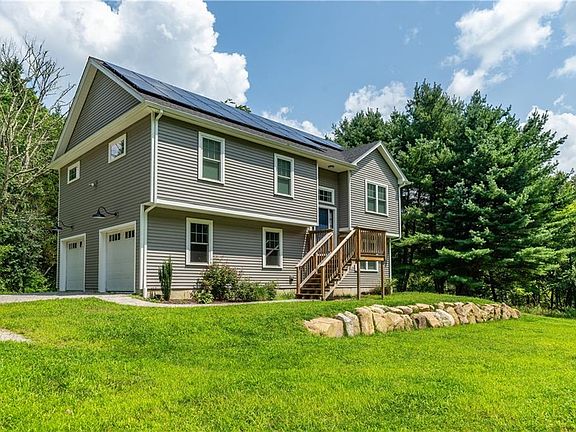 Come check out almost new Raised Ranch, situated on an extremely private 2 acre lot! Super solid custom build with all higher end materials. Hardwood floors, quartz counters, stainless appliances, stainless stove hood vent, etc...Enjoy the spacious layout featuring open concept living area with vaulted ceilings. You also get a fantastic finished lower level with outs own FULL bathroom and slider walkout at grade. Ideal setup for an in-law suite, family room, or whatever your needs are. The integral 2-car garage is finished and comes with a Tesla Charger! Solar panels on the roof are included as well.