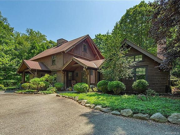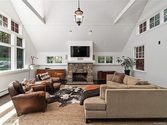 This beauty of a home is located on a private street surrounded by nature AND only minutes to town and the local MetroNorth station. Whether you are taking a refreshing dip in the pool with waterfall, a long soak in the very relaxing spa or simply sitting around the outdoor fireplace on a cool evening, this is an exceptional retreat. The house itself has been renovated for today's lifestyle. The main floor features generous sized rooms including a gourmet eat-in kitchen with an oversized island, large pantry and French doors to the outside. The living/family room has a soaring vaulted ceiling and plenty of space to entertain or relax by the fire. The dining room also hosts a fireplace and is large enough for entertaining any sized group or could be converted to living room depending on lifestyle. A covered veranda sits off the dining room through another pair of French doors and makes for a cozy outdoor seating area. On the second floor, there are two master-suites and a third bedroom. The third level offers two more rooms and is used by the current owners as a guest suite with room for a queen size bed. The lower level has French doors that allow easy access to the yard and pool area. It currently serves as an office and with flooring that has been put down could be perfect for a gym or other creative space. The detached garage holds space for two cars with an electric car charge port and plenty of storage space on the second level.