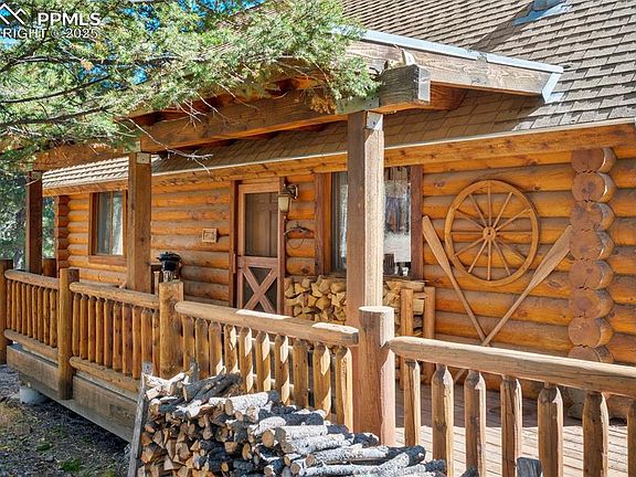 Tucked among mature spruce and pine on just over a full acre, this welcoming log cabin captures the essence of Colorado mountain living. An asphalt driveway leads to the attached one-car garage, while a wraparound deck and covered entry welcome you inside. Unique metal boot grates at the front and back doors add both function and rustic flair. In the great room you will find soaring tongue-and-groove ceilings with exposed beams, a wood-burning stove, and expansive windows that frame the surrounding forest and offer a view of Pikes Peak. The dining area sits beneath an impressive antler chandelier and flows into the kitchen with knotty wood cabinetry, ample counter space, and modern appliances. Upstairs, a versatile loft overlooks the living room - ideal for a lounge, office, or guest retreat. The finished basement offers two comfortable bedrooms, a full bath, laundry area, and direct access to both the garage and outdoors, making it perfect for family living or hosting guests. In addition, a 108 sq ft shop provides valuable extra space. Outdoor living shines with the expansive wraparound deck, abundant wildlife, and nearby access to private fishing lakes. As part of the Highland Lakes community, you’ll enjoy shared amenities including nine recreational lakes for fishing, hiking trails, playground, and a community building. Whether for full-time living or a weekend retreat, this home blends mountain charm with thoughtful details and timeless comfort.