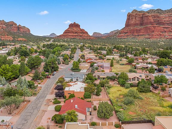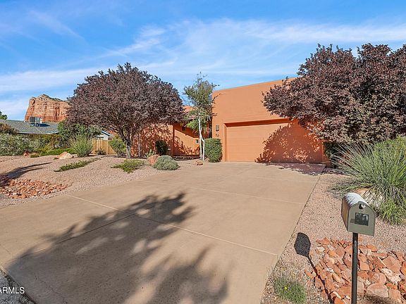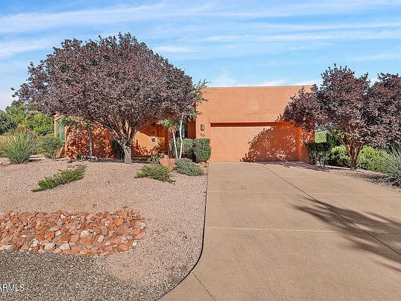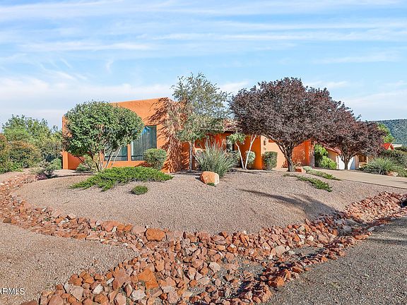 This is the One! Beautiful Santa Fe style custom home in the Village of Oak Creek on an oversized lot with Red Rock views of Courthouse Butte, Lee Mountain, and Bell Rock. 3 beds/2baths. This split floor plan is open and spacious with the Master Suite separate from the other two bedrooms; all with various views of Sedona's famed Red Rocks. Master Bath offers dual vanities, tile counters, and floors with tasteful accent tiles. High ceilings throughout. Great room with stunning stacked stone gas fireplace. The kitchen has tons of Knotty Alder Cabinets complimented with beautiful, granite counters, and stainless steel appliances. Convenient breakfast bar and large dining room with easy access to the covered patio. While sitting on your patio enjoy the fenced backyard with lush,