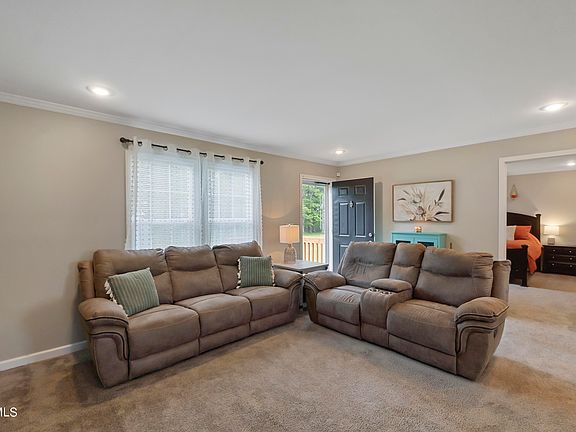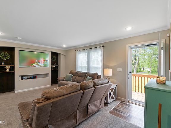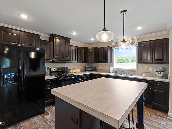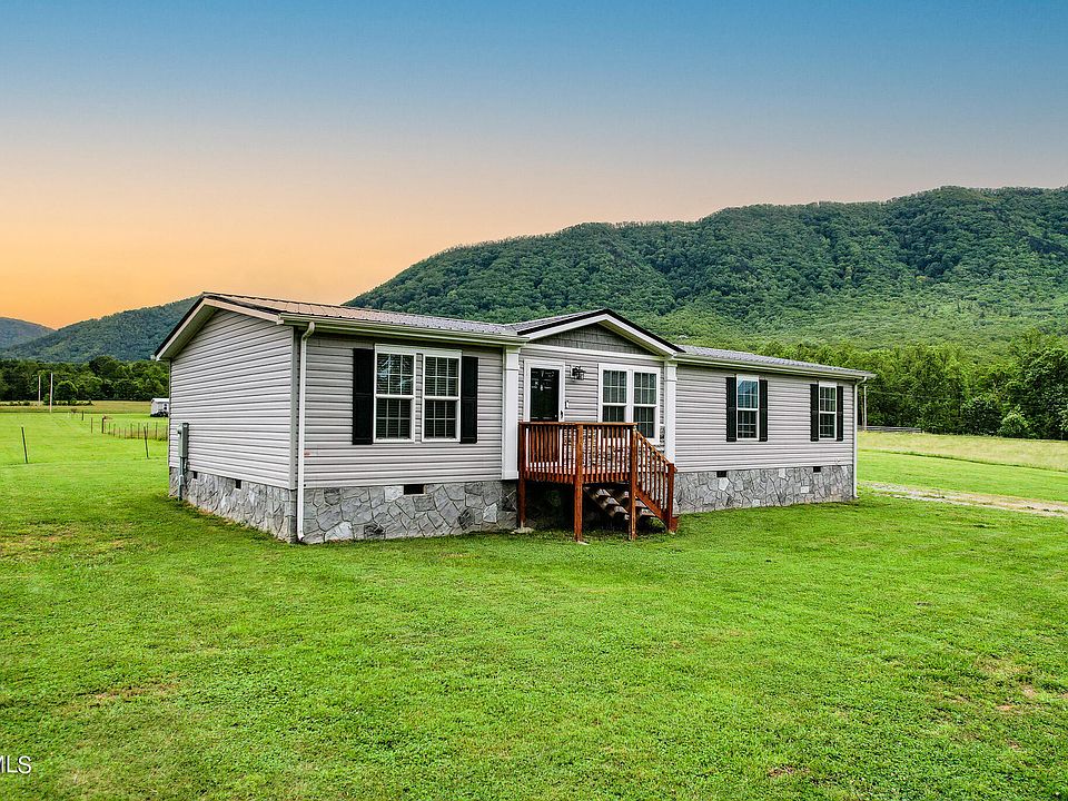 3BR/2BA packed with upgrades and an amazing mountain view! Everything you could want to set up and ready to move in. The interior of this home is beautiful with all sheetrock walls with rounded corners, arched entryways, barnwood look flooring, and dark walnut look cabinetry. The living room has carpet and built -in shelving and entertainment center. The kitchen has a huge island with bar seating, lots of cabinetry for storage and neutral counters. There is a spacious dining area just off the kitchen with a barn door to access the pantry as well with views through the sliding glass doors of the mountain views from the back deck. Recessed and pendant lighting set off this space. The primary bedroom is spacious with an ensuite primary bath that has an enormous walk-in shower with tile walls. There is also a walk-in closet with plenty of storage space and a double vanity. There are 2 other good-sized bedrooms that share a pretty full guest bath. Last but not least is the big laundry room/utility room with an entrance off the side door for convenience. No muddy feet tracking through the house!! Out front there is an outbuilding for lawn equipment and storage. Underground utilities are also a great upgrade with this one as well. Permanent foundation with stamped stone. An Excellent opportunity awaits!!