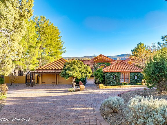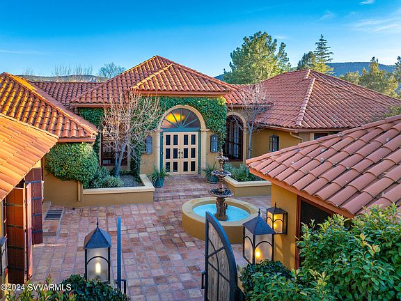 This remarkable, private, one of kind Mediterranean-inspired Villa w/pool - enjoys profound views of Oak Creek & magnificent RR Vistas. Situated on a approx. 1.5 acres & includes coveted Oak Creek frontage! Enter through the gated paver courtyard which boasts the lovely 288 sq. ft. Casita (BR suite w/BA & Kiva FP) a tiered fountain, flagstone patio, ivy covered façade to the elegant arched vestibule entry. The 3814 sq. ft. main level features refined, classic elegance -3 BR, 2 full BA, 2 half BA, spacious kitchen, DR & Study/Den & reading nook. The impressive lower level includes an add'l 2949 Sq. Ft. which includes large great rm w/ LR, DR, Kitchen, Den/Study, Large BR, Cedar Closet, Full Bath, ½ BA, workout rm, Bonus rm, the 2nd Laundry rm & Sauna. See Supplement for extensive info!! This extraordinary residence is truly one of a kind, imparting the flair of a Mediterranean villa with timeless Sedona style.