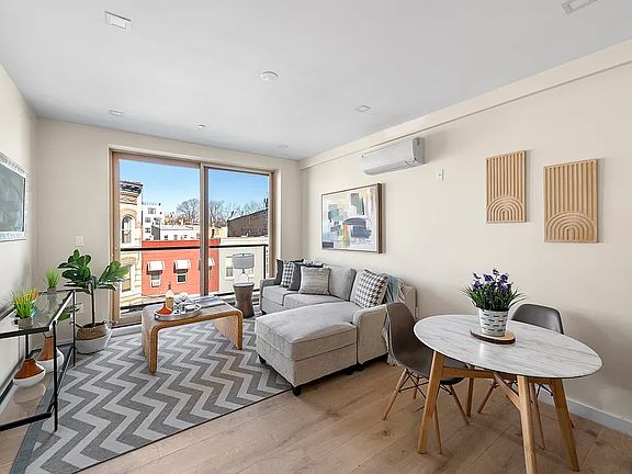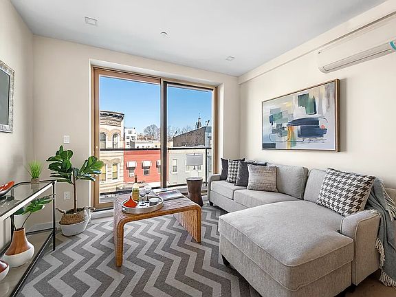 An elegantly crafted condo nestled in a quiet residential enclave in Bushwick, this brand new 1-bedroom, 1-bathroom home has private outdoor space and offers a laidback Brooklyn lifestyle close to public transportation and local restaurants, bars, and cafes. Floor-to-ceiling double-glazed Pella windows let in an abundance of natural light, highlighting beautiful wide plank pre-finished white oak floors and high ceilings with recessed lighting. Daikin multi-zone split units provide precision temperature control in every room. Residents are greeted by an open-concept living room, dining room, and kitchen that flows out onto a private balcony perfect for gardening, sun lounging, grilling, and more. The custom nobilia kitchen boasts chic Silestone countertops and backsplashes, an eat-in peninsula, wall-mounted pot filler, Summit wine cooler, Grohe faucet, and integrated high-end appliances from Bertazzoni and Fisher & Paykel. The bedroom has a deep reach-in closet and easy access to a serene full bathroom with imported Spanish tile walls and floors, a custom vanity, oversized vanity mirror with built-in storage, floating Fine Fixtures toilet, and a deep tub with smart-touch Grohe shower fixtures. The home comes with a Samsung washer and vented dryer. 68 Eldert Street is a boutique condominium close to bustling pedestrian strips like Broadway and Bushwick and Wilson Avenues. Nearby greenspaces include Saratoga and Irving Square Parks, and accessible subway lines include the J/Z/L. The building has a furnished lobby and elevator as well as a video intercom system, internet pre-wiring, and a common rooftop deck with cabanas, a BBQ hookup, and picturesque city views. Pets are welcome. Disclaimer: The complete offering terms are available in an offering plan from the Sponsor, 68 Eldert Street LLC, located at 289 Meserole Street Brooklyn, NY 11206. File No. CD22-0012. Equal Housing Opportunity.