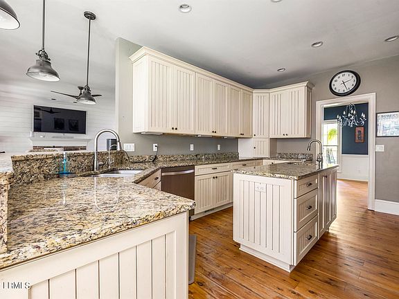 Charming Lowcountry style home on large lot, golf cart distance to Old Town Bluffton.Hardwood floors show off the open floor plan with a gourmet kitchen complete with granite counters, 42'' extra deep cabinets, gas 5 burner, dual-fuel stove, island sink,& pantry. First floor with brick fireplace, laundry room, formal dining & renovated office. Option for 2 primary bedrooms upstairs. New carpets in guest beds & option to expand with the floored third floor walk up storage. Two- 2 car garages, with renovated above garage apartment with full kitchen, bathroom, and generous storage. Screened porch, fenced yard,& covered pavilion