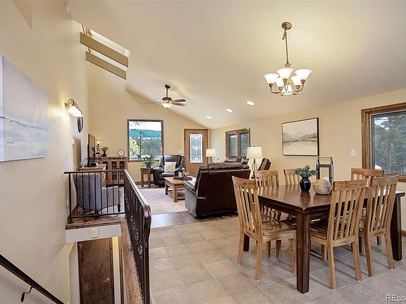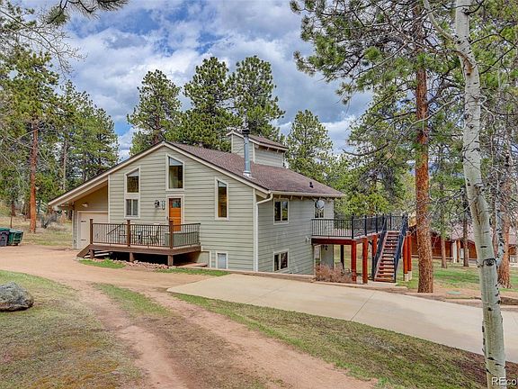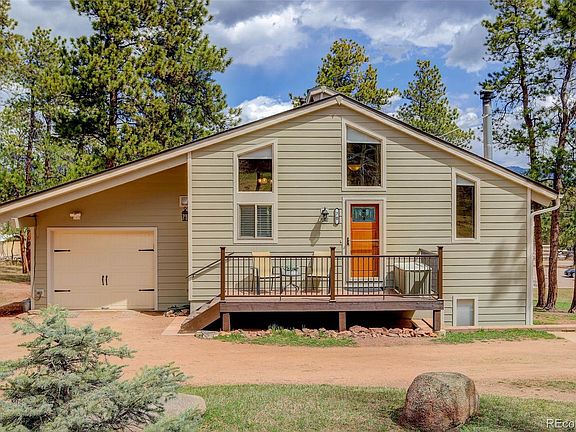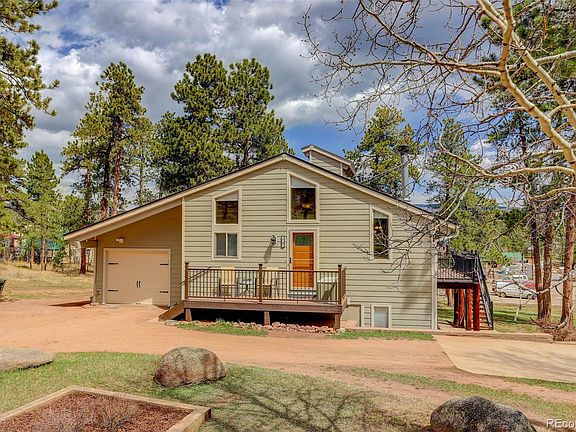 Are you longing for the peace and serenity of the mountains? Welcome to this impeccably maintained, and tastefully updated ranch style home in Pine Junction, Colorado. Conveniently located on 1 acre with quick and easy access to the intersection of Hwy 285 and Mt. Evans Blvd, this is mountain living at its best! Updated with Pella Windows, cement siding including insulation, hickory cabinets, custom wrought iron railings, new septic tank, new roof, new furnace and AC unit, this home feels like new. The main floor features a spacious living room sporting luxury vinyl plank flooring and access to an enormous, composite deck complete with wrought iron railings, a gate, and stairs to the back yard for extended outdoor living. Open to the living room lies the dining room creating a great space for entertaining. The kitchen boasts hickory cabinets, black stainless appliances including a new range, and a movable island. Step into the secluded, primary bedroom featuring vaulted ceilings, a ceiling fan, and private deck access. There's custom tile flooring and tub surround in the primary full bath as well as a jetted tub. Venture down to the walk-out basement where one will find two additional bedrooms, a 3/4 bath, an oversized laundry room with numerous built-in cabinets, and a cozy family room with direct access to the back yard. There is also a one car, insulated and dry walled, attached garage as well as a 26’ X 60’ detached garage/workshop with an 11’ door. The insulated, detached garage is equipped with a gas, forced air heater, stereo receiver and four speakers for a great sound system, and various 120V and 220V receptacles. In addition to this amazing garage, there is a shed, and an expansive concrete pad for additional outdoor parking to include an RV spot with a 50A-125/250V plug. This property has had professional fire mitigation and is conveniently walkable to a coffee shop, bakery, gym, restaurant, country and hardware store, post office and lumberyard!
