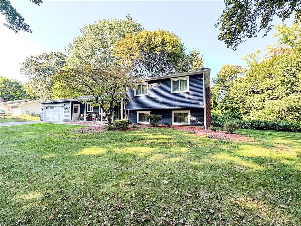 Welcome home to this beautifully maintained 3-bedroom, 2-bath split-level tucked away on a private cu-de-sac.Set on a wooded lot, this home offers the perfect blend of comfort, updates, and charm. Step inside to findgleaming hardwood floors, a spacious eat-in kitchen, and formal dining room with French doors leading to abright 4-season room- ideal for relaxing year round. The inviting family room features classic wood paneling anda cozy fireplace, making it the perfect spot to unwind. The primary bedroom has direct access to the main bath,adding convenience to the thoughtful layout. Enjoy the outdoors on the new Trex deck with brand new frenchdrain, or relax on the covered front porch while taking in the private surroundings. The partial finished basementoffers additional living space or room to grow. This home has been extensively updated with a new roof, siding,boiler, water tank, garage door, gutters w/ covers and two ductless HVAC systems for year-round comfort. Musiclovers will appreciate the built-in kitchen speakers, perfect for entertaining. The attached 2-car garage completesthe package. With 1,850 sq. ft. of living space, modern upgrades, and timeless character, this home is move-inready and waiting for its next chapter! DELAYED NEGOTIATIONS UNTIL 10/06/2025 ALL OFFERS DUE BY 3:00 PM.