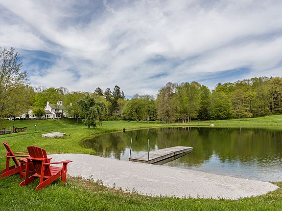 One of the treasured estates and settings in Litchfield County with aesthetics and design by Designer Lou Marotta. Stunning views over 10.8+ acres of private open pasture, wildflower meadows and two spring fed ponds. A long driveway leads to an additional 2 bedrooms in the guest house. A heated gunite pool and pool house complete with living area, studio space and screened porch over looks the pool and apple orchard. The home reads as vintage and offers 3 bedrooms in the main house, high end Kitchen with 19th century tiles from Spain, antique french limestone flooring an reclaimed wood floors, carrara marble baths. The master suite offers viewscapes out the sumptuous grounds. Professionally designed gardens and stone terraces create easy entertaining from the french doors which lead out of the public spaces. The library is directly off the master suite and offers fireplace and limestone floors . The red barn-style pool house is just a short distance from the main house and offers both kitchen and living area or studio space along with a screened porch which overlook the pool and gardens. The ultimate in private settings, yet just a short walk to the Village Store and Bistro make this elegant home one of the gems in Litchfield County.