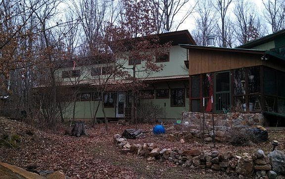HG2027 - JEWEL in the Ozarks--10 acre tract located in the heart of a Land Trust of 1,000 acres of protected forest (adjoining the Jack's Fork National Scenic Riverway), guaranteed to remain pristine for generations. Custom-designed two-bedroom home offers over 1600 SF of living space plus huge lofts, a utility basement, and fully enclosed screen porch. Self-sufficient homestead is on-grid/off-grid with an active/passive solar design with a propane powered generator; wood furnace provides radiant heat flooring throughout; drilled well; composting toilet in separate bath house. Separate 380 SF Yurt. Taxes $540.