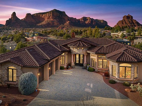 A Sanctuary for the Senses! Classic luxury living located in the gated community of Firecliff, ''The Highlands.'' From the moment you enter, your eye is drawn to the broad walls of glass opening to the outstanding panoramic views captured by this thoughtfully designed elegant home! Unobstructed Mega Views of Castle Rock, Bell Rock, Courthouse Butte, Lee Mountain, and more. An exceptional single-level, split-bedroom floor plan comprises 3607 sqft seamlessly flowing to provide ample space and intimacy all at the same time. Soaring 12' ceilings with impressive coffered details throughout. Great room features beautiful hardwood floors with a wall of polished travertine showcasing the fireplace. Gourmet kitchen features two large granite islands, custom cabinetry, Wolf/Subzero appliances, appliances, built-in pantry with an abundance of pull out drawers. Designed with Indoor/Outdoor living in mind, the generous 870+ sqft covered deck can be accessed from two suites as well as the great room. Elevating your experience, the outdoor kitchen includes a new built-in Wolf BBQ, granite counters, sink and refrigerator. Enjoy low maintenance outdoor amenities such as the dog run & firepit with privacy from adjacent wash. Inside you'll love the private two wings including the primary suite with laundry room and a separate guest wing with three additional ensuite bedrooms offering plenty of space for family and friends to visit. Primary suite welcomes the peaceful tranquility of the red rocks with a spa-like retreat boasting floor-to-ceiling stone work, shower with "rain" fixture, hydro system soaking tub and a huge walk-in closet. Bonus rooms include a formal dining room and executive office for the in-home professional. Notable features: 800 sq. ft. three car garage, whole house water filtration system, tankless water heater, etc. Call today for your private viewing!