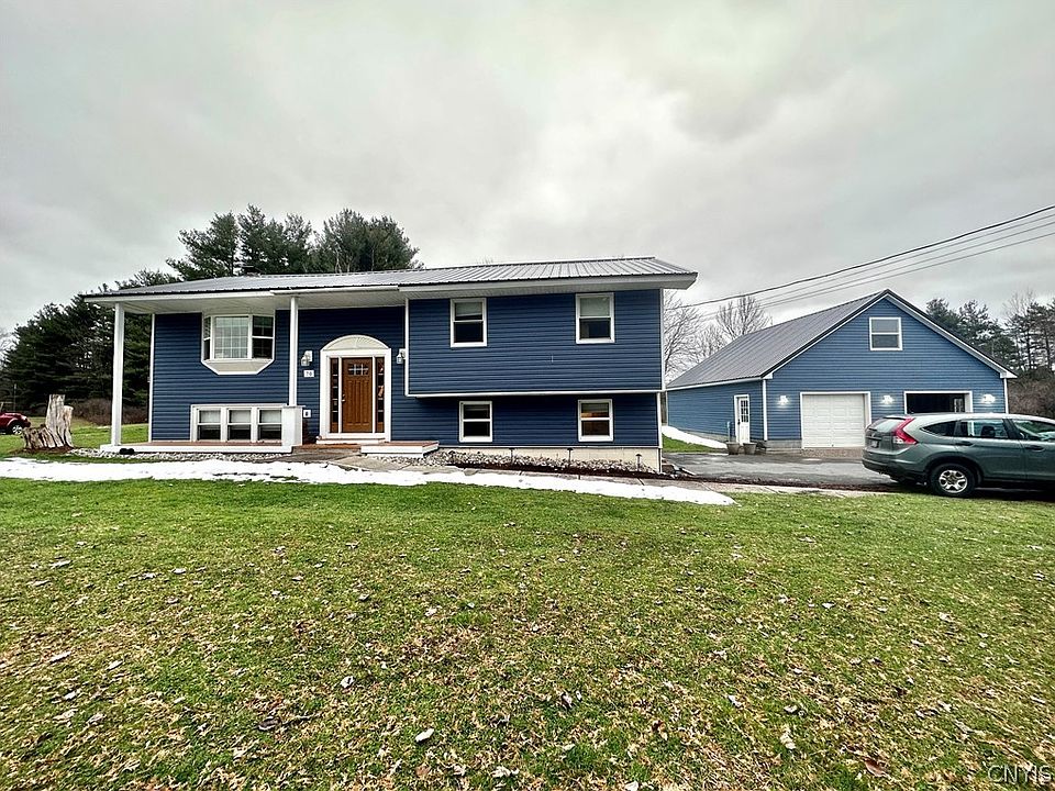 Welcome to this beautiful split level home. Situated on just over 1 acre, this home has it all. Outside you'll find a paved driveway, an oversized two car garage with storage overhead. There is a generator and central air and an inground pool! Inside you'll find a gorgeous kitchen with vaulted ceiling, solid surface countertops and an island. There is enough room for a table and there is a fireplace for ambiance. The sliding doors lead out to a two tiered deck and the pool. There is a bright living room and custom railings for the staircase. The large bath features double sinks, and a separate jetted tub and tiled walk in shower. There are 3 bedrooms on this main floor. Downstairs is a walk out to the driveway, and a second living space. there is 1-2 bedrooms down there with a laundry space, storage space and a half bath.