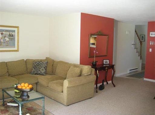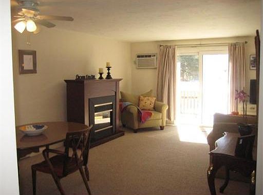 Sun-splashed townhouse in wonderful commuter location, beautifully maintained & ready for immediate occupancy! Spacious open floor plan w/2-story entryway. Inviting living room overlooking deck & lovely wooded grounds. Open the door to let sunlight & nature in this summer, or cozy up to the charming electric fireplace during the colder months! Large dining area has convenient pass-through to the eat-in kitchen. Bright and cheerful finished family room in basement w/recessed lighting, plus a huge heated utility room with washer/dryer, also perfect for a workshop! Airy second level featuring 2 bedrooms, including a closet-packed master bedroom w/direct access to the full bath. The recent addition of built-in air conditioning on the 1st floor insures year-round comfort. Other recent updates include lighting, interior paint, basement finish, insulated windows, & new slider! This home has been lovingly cared for and you will not find a cleaner, more welcoming condo on the market today!