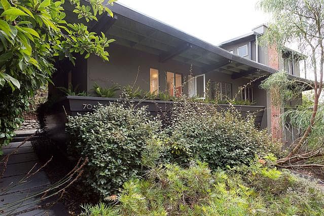 Sleek updating with mid-century beams & walls of glass! Surrounded by lush gardens providing a most private courtyard. 3BR/2BA on main level, loft/office with full bath & lower family/media room w/separate entry. Close to parks, schools, and convenient transportation.