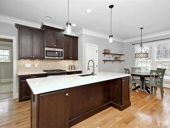 Looking for space, inside and out? You've found it! Custom home rests on an acre. Gorgeous hardwood floors and open concept welcome you. DOWNSTAIRS master with sitting area, dual sinks, and dual closets. Additional bedroom downstairs with full bath. Gas cooking in updated kitchen. Private, screened back porch and patio. Beautiful custom details throughout! HUGE unfinished bonus. Detached 2 car garage is home to a full guest suite with an additional bathroom, kitchen, and laundry hookups. Minutes to RDU!