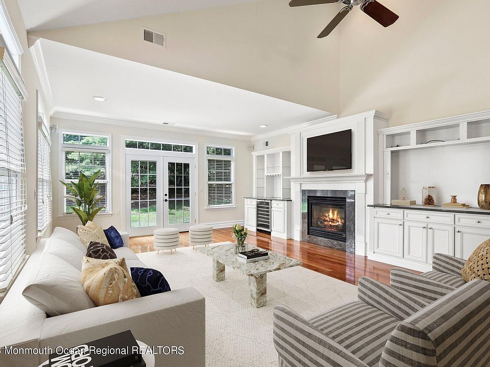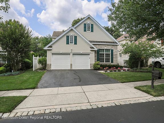 A former model home and one of the largest models in the community, 70 Londonberry Drive in Cedar Village at Holmdel offers an elevated take on active adult living. This Sonoma model has a first floor primary suite with two additional bedrooms and a second full bath on the upper level, along with a flexible use loft space. Beautifully maintained hardwood floors literally gleam throughout nearly all of the home, while the two bedrooms on the upper level have new carpeting. The whole home has been freshly painted, presenting a fabulous canvas upon which the new owners can create their own masterpiece. The formal living and dining room both feature custom pleated shades, picture frame and crown molding, and upgraded lighting fixtures to provide an elegant backdrop for formal gatherings. The center island kitchen has stainless steel appliances, granite countertops, a stylish tile backsplash and layered lighting from recessed lights, pendants above the island, and a light fixture above the table in the breakfast area. A knee wall bridges the breakfast area and the spacious, light-filled family room lined with transomed windows and French doors leading to the patio. A gas fireplace provides a striking focal point, and is bookended by built-ins on either side, with one side providing the perfect bar cabinet, complete with wine fridge, stemware slots, and glass shelves on which to showcase your top shelf bottles. The first floor primary suite has a tray ceiling, two walk-in closets and a large en suite bath with a soaking tub, a separate shower with bench seat, and dual sinks. The hardwood staircase has a runner with stair rods and leads to the second floor loft. The picture frame molding lines the walls of the staircase, as well as the loft area. In addition to the loft, two bedrooms and full bath, the upper level also has a walk-in attic for additional storage space. Additional features include a central vacuum, painted two-car garage with storage cabinets, first-floor laundry room with storage cabinets, newer HVAC and a truly spectacular location backing to the impeccably maintained clubhouse grounds. The community amenities located on the grounds include not only the clubhouse, but also bocce , an outdoor pool and spa, putting green, and tennis court. Enjoy easy access to the scenic Jersey shore, the Garden State Parkway, public transit including train, bus and ferry and so much more!