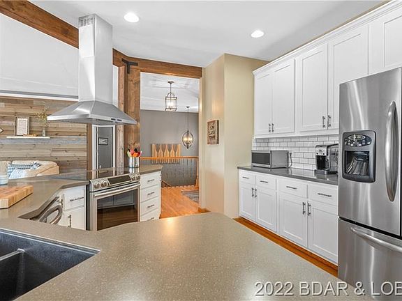 Get ready to be mesmerized because this home has it all! Situated on the 43MM with pavement all the way to the door, this home offers 4BR/4BA, panoramic views, 9ft ceilings, main level living, & parking for 7. There's a newly installed roof in 2021. The kitchen was recently updated & presents a massive island, white subway tile backsplash, stainless steel appliances, beautiful wood pillars, & is near a gas fireplace to stay warm in the winters. The master suite provides a gorgeous lake view, newer LVP flooring, walk-in shower, & updated dual vanity with a quartz top. Downstairs provides a second entertainment space, an enormous bar and refrigerator, & a large screened in porch that's perfect for entertaining family & friends. The house comes with a massive two well dock(two PWC spots as well) that has recently updated concrete tiles. Walk right in & enjoy the home immediately as this stunner comes furnished & includes a 10k lb boat lift & dual PWC lift. Come see this beauty today!