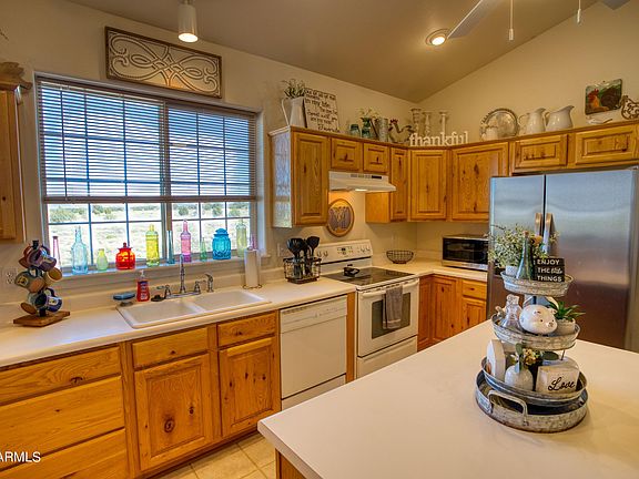 Rare opportunity to own an immaculately maintained home, situated on the high ground of an expansive 37+ acre parcel, with a pristine view of a nearby lake! Top-quality composite decks are on three sides of the home, affording unparalleled views of our spectacular Arizona sunrises, sunsets, and the dark, star-studded skies at night. Boasting quality construction & superior insulation throughout, year-round energy efficiency & comfort are ensured, & the water supplied by the private well provides self-sufficiency. Quality components in the home include custom stained glass windows for a unique touch of artistry, & the Pottery Barn window coverings convey a sense of quiet elegance. The versatile1500 s.f. shop/garage (Quonset hut design) assures ample space for parking & projects! Click: This fully-fenced and private property, serenely located only about a mile from the paved highway over a good quality, all-weather gravel road, is the perfect answer to either year-round living or as a get-away retreat from the hustle and bustle of urban living, and could be developed into a sustainable, self-sufficient property with plenty of room for gardens and the livestock, toys, vehicles/machinery, or implements of your choice! Additional info: The home has recently been refurbished and upgraded, with new flooring, vanities, and paint. There is a formal dining room that could also be used as a formal living room, depending on preference; no closet in the 3rd bedroom, currently used as a den. The fireplaces that will convey with the home are electric, and create a comfy, peaceful, cozy ambiance on those chilly evenings. There's power to the shop/garage, and water could be easily piped there, as well. There is Frontier DSL to the property, supporting very good internet and streaming capability. See this unique property to appreciate!