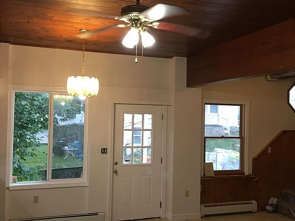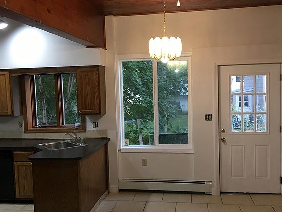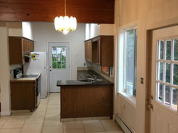 Must see! Spacious apartment with 9 foot wood ceilings and beams on first floor, modern high energy efficiency appliances, stove, refrigerator, brand new washer and dryer. Dishwasher included. Highly energy efficient cost effective gas on demand hot water heater/ furnace, baseboard hot water heat, new energy efficient 15,000 BTU wall unit air conditioner, wood pellet stove, porcelain tile throughout the first floor, carpet in stairway and two upstairs 17 x 14 front bedrooms, laminate hardwood floor in 22 x 22 master bedroom with four 4 x 4 skylights, skylights in all upstairs bedrooms, bathroom and hallway, large walk in closets, off street parking, fenced in backyard, close to route 63 and route 8, close to parks, blocks from elementary school, quiet neighborhood. No smoking. One month security, first month rent, Background and credit check required. Viewing by scheduled appointment. Tenant responsible for utilities