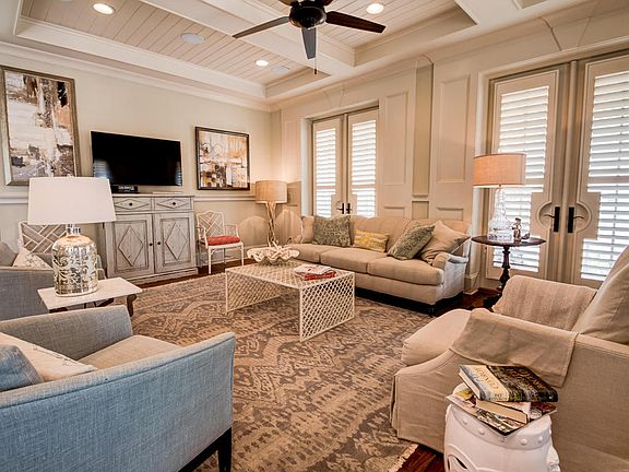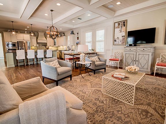 THE GENERAL'S HOUSE. Stunning custom luxury home south of 30A in the town of Prominence. This spacious 4-bedroom concrete, steel construction home boasts elegant features throughout including authentic African teak hardwood floors, Italian marble countertops, coffered ceilings, custom plantation shutters, and extensive custom millwork and trim. The gourmet kitchen boasts stainless steel appliances, gas range, and a massive kitchen island. A guest bedroom downstairs, plus two additional bedrooms and a separate master suite upstairs - all with private en suite baths - sleep a total of 12+ making this home perfect as a rental investment or a second home/primary residence for large families. Only one of two homes in Prominence with concrete construction.