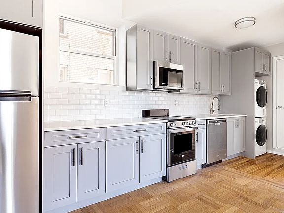 Welcome to your new home across the street from Prospect Park, in the heart of Park Slope. This apartment, situated on the third floor of a six-story pre-war elevator building, provides a living experience with in-home laundry and renovated kitchen. Positioned at the prime intersection of Prospect Park West and 3rd Street, this home offers peaceful views of serene townhouse gardens and convenient access to everything Park Slope has to offer. Upon entry, you'll be greeted by a welcoming foyer and a spacious entrance hall, featuring closets and additional storage options, ensuring your home remains organized and clutter-free. The open living area, which seamlessly integrates the updated kitchen, offers a versatile space that can easily accommodate both living and dining needs. The thoughtful layout creates a natural separation between the two bedrooms, providing privacy and comfort. The renovated kitchen is a chef's dream, featuring custom shaker cabinets, a stylish subway tile backsplash, and full-sized, high-quality stainless steel appliances. Whether preparing a quick meal or entertaining guests, this space is designed to meet all your culinary needs. The primary bedroom is generously sized and offers expansive western views of the tranquil townhouse gardens, allowing for a serene retreat at the end of the day. The second bedroom is equally flexible, ideal for use as a home office, guest room, or additional living space to suit your needs. Both bedrooms are filled with natural light and are designed for maximum comfort. The updated windowed bathroom, also facing west, is both functional and elegant, with ample vanity storage, a soaking tub, and modern subway tile details that complement the apartment's overall design aesthetic. 70 Prospect Park West is a distinguished pre-war elevator building known for its spacious apartments and superb location. Residents enjoy easy access to Prospect Park, just steps away, along with nearby subway stations that provide convenient transportation options. The 7th Avenue station, which serves the F train, is nearby, and Grand Army Plaza offers access to the 2 and 3 trains, ensuring quick and easy travel throughout the city. Please note that some of the photos have been virtually staged to help visualize the full potential of the space. This is an exceptional opportunity to live in a vibrant neighborhood with unmatched convenience, a quiet oasis, and modern amenities. Don't miss out on making this charming apartment your new home.