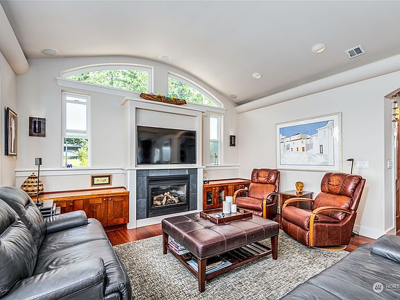Breathtaking water & mountain views permeate this exquisite Cape George Colony home featuring custom finishes and versatile floor plan. Curved archways lead to inviting living & dining areas, with seamless flow to the spacious sun deck. The kitchen dazzles with endless views and smart design. The sumptuous primary suite features two-sided fireplace, soaking tub, walk-in shower, and walk-in closet. Brazilian cherry hardwoods add elegance throughout the home. The lower level includes gathering room w/kitchen & 2 bedrooms + bath, perfect as long-term guest quarters/ADU. Fully fenced back yard with patios & lovely garden. Convenient parking area for RV/boat. Cape George amenities include marina, clubhouse, gym, indoor pool, pickleball & more.