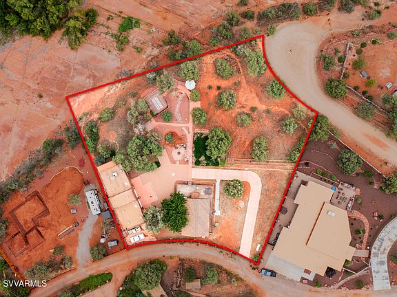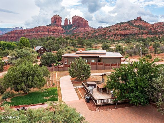 Steps from the magical banks of Oak Creek and less than a mile from Red Rock Crossing Vortex sits a unique gated compound nestled on over an acre with private gate to Coconino National Forest. This one-of-a-kind property offers views of Cathedral Rock and a sprawling backyard perfectly set up to host gatherings, retreats, weddings and other private events. TWO structures here include the 1086 sf main home with 2 bed/1 bath and large wraparound deck PLUS a 756 sf 2.5 car garage with lift and workshop AND 1 bed/1 bath 804 sf apartment built in 2007 featuring a full kitchen, dining and living area with two-way fireplace and French doors that leading to private balcony to take in all the viewpoints. Below the apartment is a 600 sf (approx) downstairs game room, bar, wine cellar, walk-in vault and walk-out patio that leads to the expansive backyard. The possibilities here are endless and AirBnB friendly. This isn't just a home; it's a unique experience that offers a lifestyle you won't find anywhere else. Rainbow Lane is all about relaxation and enjoying the beauty of the surroundings. Price is reflective of some unfinished work left for the next owner to make it the masterpiece it is destined to become.