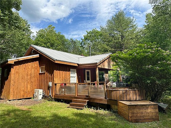 Discover your serene retreat in this charming 2-bedroom, 1-bathroom cottage, perfectly nestled on 5 picturesque acres just minutes from Margaretville. This delightful home boasts a well-appointed kitchen with modern amenities, seamlessly flowing into a sunny eating area that captures the morning light. Relax on the inviting front porch or entertain on the partially covered rear deck, complete with a cedar soaking tub, ideal for stargazing or unwinding after a long day. The property features a fenced-in yard, perfect for pets or gardening, and a tranquil frog pond, offering a peaceful natural setting. Bordering protected DEP land, this idyllic cottage provides the perfect balance of comfort and outdoor living, making it an ideal getaway. Air conditioning, a claw foot tub, lots of natural light, an exterior storage shed are just a few of the appealing features. Experience the best of country living with the convenience of nearby Margaretville's shops, restaurants, and recreational activities. Don't miss the opportunity to make this enchanting property your own. Located about 2.5 hours from NYC and close to skiing, hiking, boating and shopping!