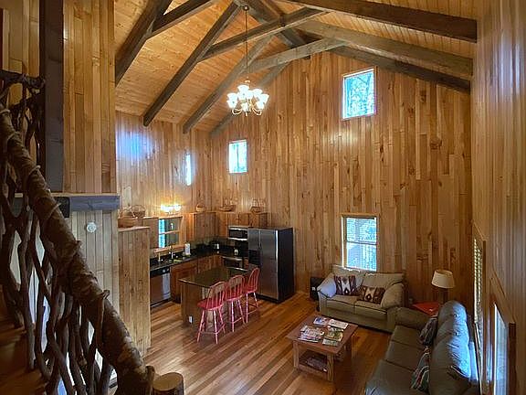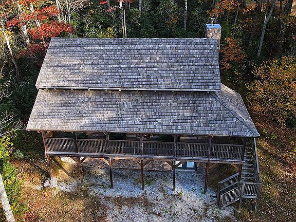Relax and sit on the covered porch of this private mountain retreat surrounded by nature. This 2BR + bonus room/2BA log cabin is located on a private cul-de-sac in the historical Winding Stairs community, and is the perfect place to call home. This house was constructed with hand-hewn logs, board and batten siding on the backside, and a cedar shake roof. It has an open concept kitchen and great room with spectacular vaulted, cedar beamed ceilings and oak hardwood floors. The handcrafted kitchen cabinets and center island are made of rare wormy chestnut wood with granite countertops. The great room features an open staircase leading to the second level with handrails made of local twisted mountain laurel. There is 1 bedroom, a bonus room, and a large bath located on first floor, while upstairs there is a large bedroom with a vaulted beamed ceiling and bath. Each bathroom has granite countertops, slate tile, and pine paneling. The finished basement has a window and sliding glass door that brings in a lot of natural light. Located within minutes to popular attractions such as Linville Falls trailhead, Linville Falls, Grandfather Mountain, ski resorts and more!