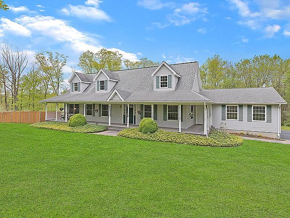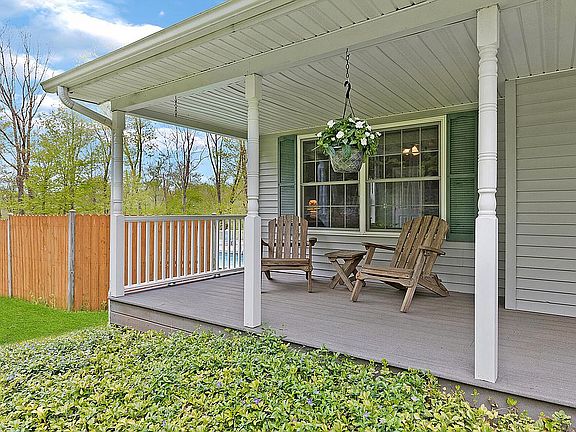 Loaded w curb appeal this pristine custom home is perfectly nestled on a 5 acre lot backing to the Spruce Run Creek. Welcoming wrap-around rocking chair front porch. Large living room w gas fireplace has French door access to the cathedral ceiling dining room. The spacious dining room has sliding glass doors to the deck and yard perfect for parties and barbecues. Open concept kitchen has a large Corian topped breakfast bar, abundant oak cabinetry w pull-outs and decorative tile back-splash. Comfortable family room. Desirable 1st floor master bedroom has an organized walk-in closet. Master bath w jetted tub and stall shower. All bedrooms have great closet space. Large loft offers additional living space. Attached garage has direct access to full basement w Harmon Pellet Stove. Above ground pool. Tranquil, private lot.