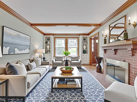 Beautiful center-entrance Colonial on desirable corner lot in prime Bellevue Hill location. Spacious living room features beamed ceiling, crown molding, and classic wood-burning brick fireplace. Formal dining room showcases custom built-in hutch, crown molding, and chair rail. Large eat-in kitchen opens to deck overlooking professionally landscaped grounds with mature plantings. First level also offers bonus family room with large picture window, foyer with coat closet, and tiled half bath. Second level offers three bedrooms, tiled full bath, linen closet, and views of the Boston skyline. Gleaming hardwood floors flow throughout. Full walk-up attic with heat offers excellent expansion potential. An elegant entry portico, decorative shutters, wrought-iron railings, and bluestone and brick steps enhance this home's curb appeal. Just a short walk to the commuter rail station (0.3 miles) and to neighborhood shops and restaurants.