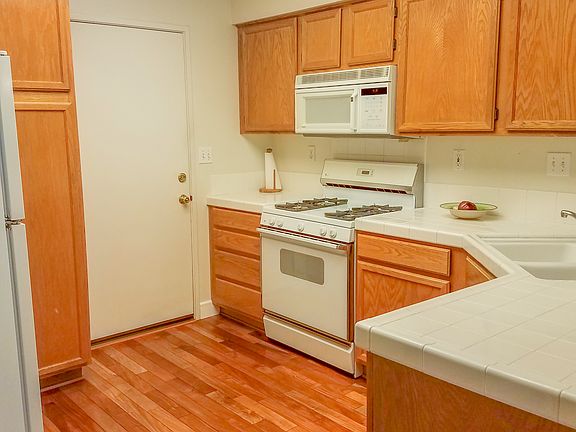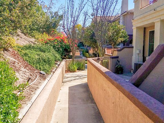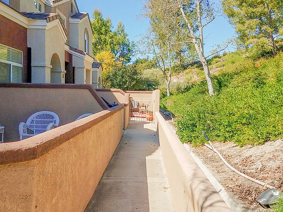 Resort living in "The Vineyards" desired community. This sparkling clean end unit has natural bright light and soaring vaulted ceilings. There are two outside entertainer's patios. The larger patio is conveniently adjacent to other living spaces in an open floor plan. Romantic fireplace. The cook's kitchen sports newer stainless appliances, oak cabinets and a high coved ceiling with plenty of newer lighting. There are two full bedroom en-suites; the spacious master with dual sinks, a soaking tub and large upgraded walk-in closet. Exquisite designer finishes throughout. The fun feature, extra west-facing patio, affords many possibilities. Two car garage with storage and direct access. Central heat/AC. Gorgeous mature palm trees in a lush landscaped low HOA complex. Resort-style pool, spa and playground. Close to hiking, biking, schools, shops, tollway and freeways and The Whiting Ranch Wilderness Park. Bring your most discriminating clients...welcome home.