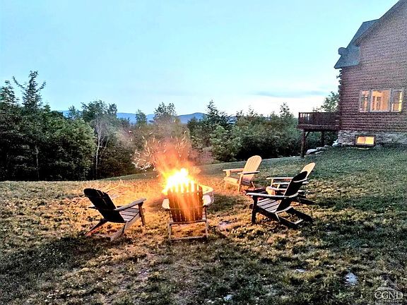 Introducing for the first time on Market: Perched on the foothills of the Catskill Mountains, discover a quaint enclave of custom log homes boasting big sky views of Windham Mountains ski slopes. Welcome to; (aka) Lynch's Lodge a meticulously crafted residence designed for family gatherings depicting the perfect combination of bedrooms and living space. Featuring native log beams, slate to gleaming wood floors throughout, antler chandeliers from vaulted ceilings a central stacked fieldstone fireplace with a hand- hewn log mantle, a floor to ceiling wall of glass windows showcasing its breathtaking mountain valley views all complemented by a well-appointed open kitchen dining area wrapped with wood tone KraftMaid Cabinetry, granite countertops, stainless steel appliances, and the convenient beverage center boosting additional countertop space to display your weekend charcuterie boards and mocktails!Unwind by the fireplace after a long day skiing or soak in the hot tub on the main floor outdoor deck.The private primary suite includes its own balcony, king size bed, walk- in- closet and a rustic yet elegant bath with a pampering jet tub or step into the oversized shower with stream pebble flooring and barn side tile walls.The second floor offers two spacious bedrooms and a secondary En Suite decorated with peaceful soft tones, dreamy plush carpeting and captivating views.Retreat to the lower-level bunkroom, an entertainment area, full bathroom, gym area, washer and dryer set behind sliding barn doors and an essential mud room; all with walk out access to the lower parking area equipped with EV car charging system and outdoor fire pit.This exceptional home surpasses expectations with its quality construction, thoughtful floor plan and overall ambiance of modern Catskill Mountain living. Contact us today to tour this distinctive mountain log home, ideal for your family retreat or to assume its five-star successful rental history.