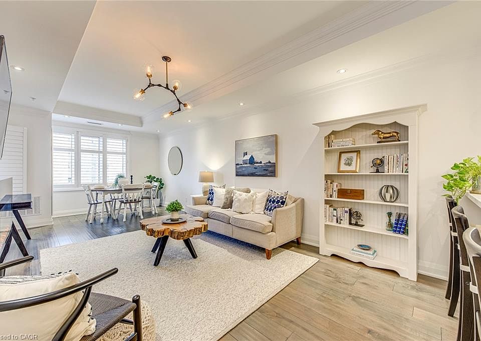 Stunning 2 bed, 2 bath suite in the heart of Kerr Village. With over 900 square feet of thoughtfully designed living space, this top-floor unit in an exclusive 4-storey low-rise building is a rare find. The open-concept living space features 9-foot ceilings, wide-plank hardwood floors, and crown molding throughout, creating a bright and sophisticated atmosphere. The gourmet kitchen boasts premium white cabinetry, quartz countertops with waterfall edges, hidden pantry a full suite of stainless steel appliances, and elegant pendant lighting over a spacious breakfast bar. The adjacent living and dining area is both stylish and functional, with large windows that fill the space with natural light and provide a seamless flow out to the private balcony. Enjoy morning coffee or unwind in the evening surrounded by lush greenery and serene views.The primary bedroom offers a tranquil retreat with custom built-in wardrobes, ample closet space, and a calming neutral palette. A versatile second bedroom can serve as a guest room or home office, complete with mirrored storage and a built-in workspace. The bathrooms feature refined finishes including marble-look tile, modern vanities, gold hardware, and designer lighting.Additional highlights include in-suite laundry, upgraded lighting fixtures, and thoughtful storage solutions throughout. The furnace has been recently serviced and is in good working order, adding peace of mind. The suite includes in-unit laundry, a tandem two parking spot on P1 for two cars, and a private storage locker. Step outside and you're moments from multi-million dollar homes, the tranquil shores of Lake Ontario, vibrant Kerr Street, and downtown Oakville. Enjoy the serenity of nearby green spaces like Tannery Park and 16 Mile Creek, while staying connected with quick access to Oakville GO Station and major highways. You will love calling this home.