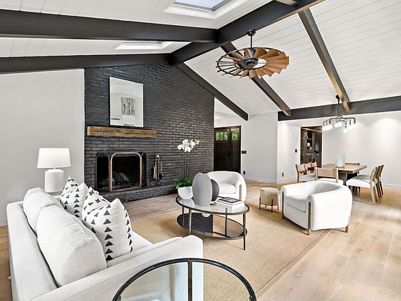 Remodeled and expanded on 1.3 level acres with tennis court, views, and beautiful grounds in central Portola Valley. Custom craftsmanship and artistic detail showcase cathedral ceilings with industrial lighting and windmill-style fans, numerous skylights, and reclaimed wood accents creating rustic sophistication. Two dramatic works by a Post Ranch Inn artist a sculptural stainless-steel fireplace surround and a custom steel hot tub on the elevated deck merge art and function. Gourmet kitchen with French Lacanche range and rolling ladder to upper storage. Primary suite couture closet designed for nearly 500 pairs of shoes also has a rolling ladder plus a spa like bath with open shower. Natural landscaping, pollinator gardens, and impressive variety of fruit trees. Private tennis court enhances the rear grounds. Moments from the town center and Windy Hill trails for the ultimate Portola Valley lifestyle. Excellent Portola Valley schools.